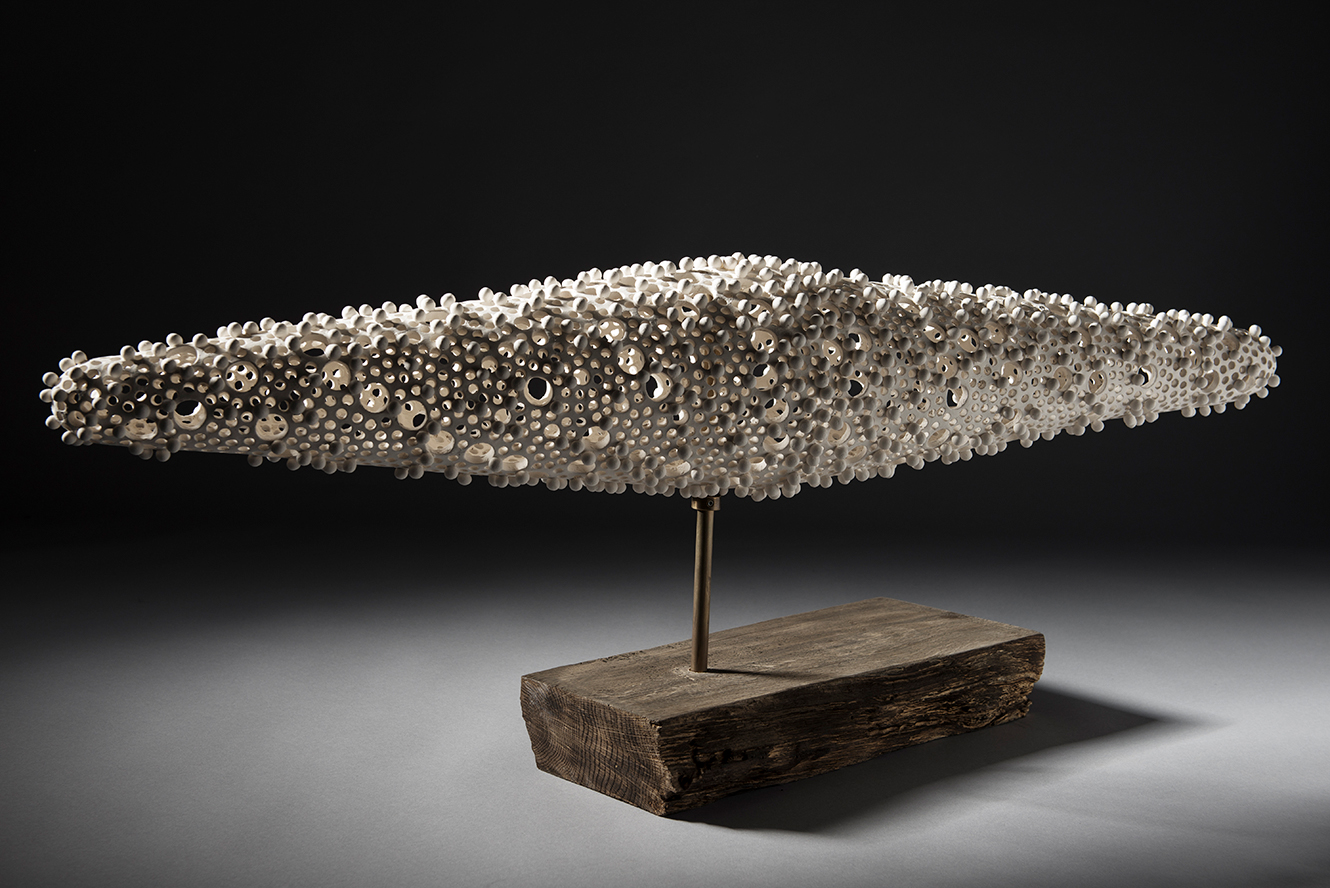 The form, the attached balls and the holes are handmade. Balls are fixed on the surface before firing. I make the mix of paper clay by myself with my own recipe.
