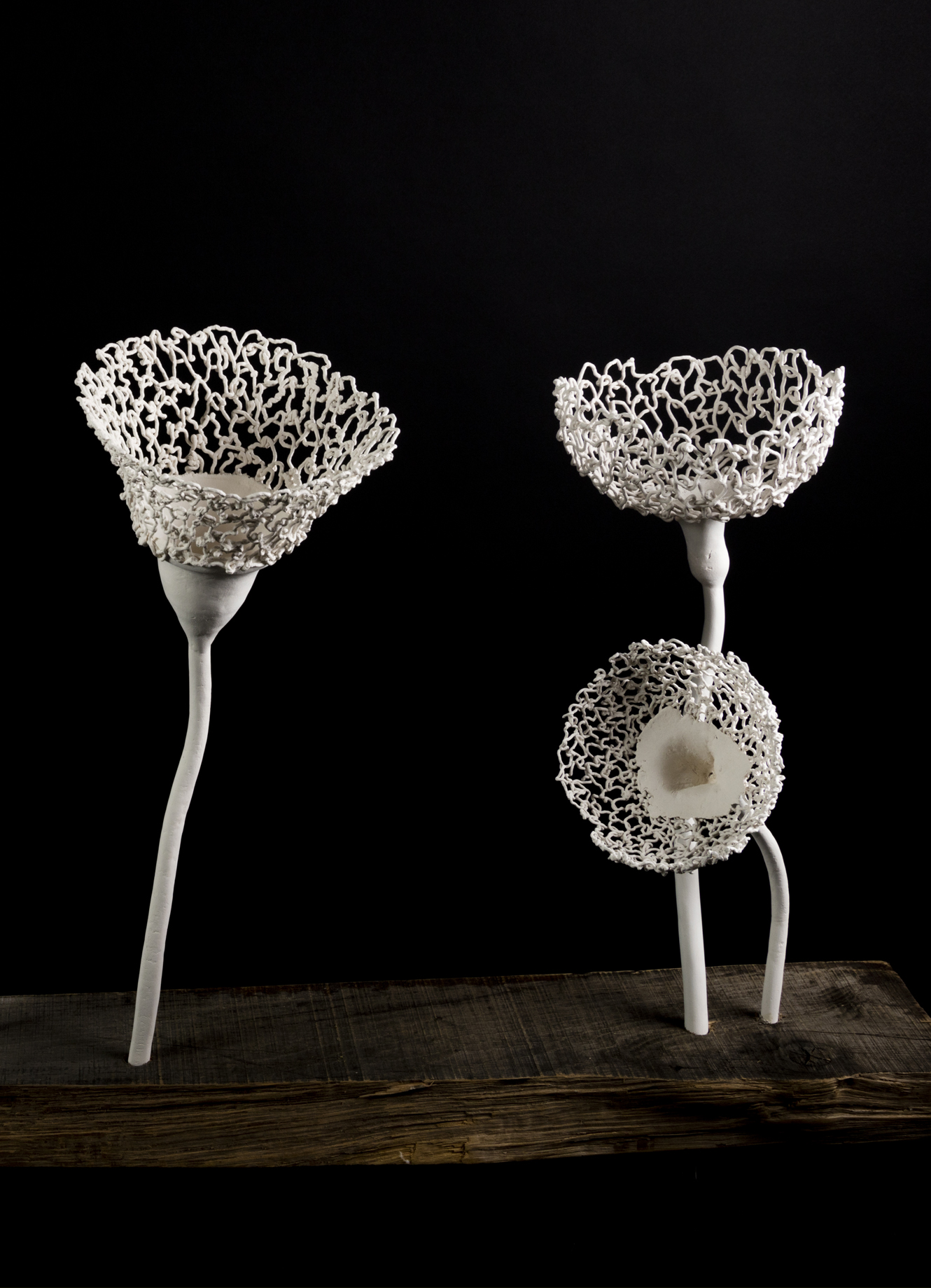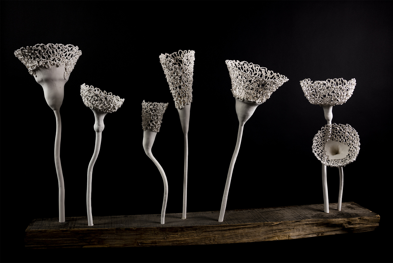 The ceramic flowers are embedded into the wooden stand which is also a part of the installation. The flowers are asimetrically but thoughfully placed into the composition, every flower stalk ends with a blossom which is carefully and subtly designed.
