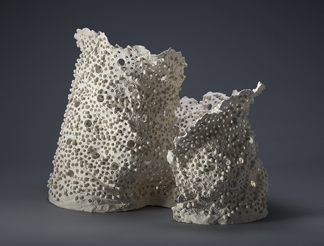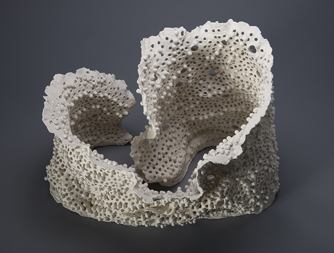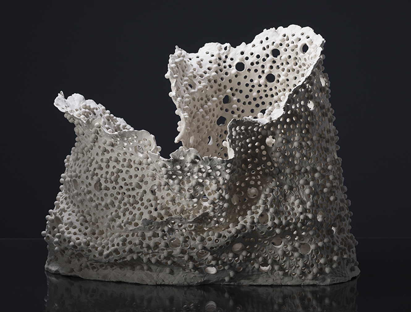 I wanted to make an organic form that represents a nest, a home, a shelter of the Proteus. We can interpret the balls that we see on the surface like attached eggs or the water drops which are tipical for the underground world. The web of holes presents the simbol of light and life, a fragile and sensitive world which resists in hard conditions like darkness, cold and moisture. The form, the attached balls and the holes are handmade. Balls are fixed on the surface before firing. I make the mix of paper clay by myself with my own recipe.